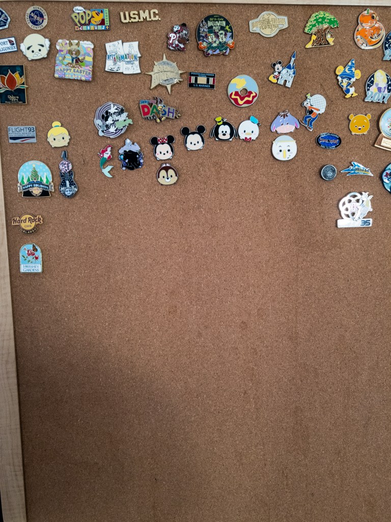 One thing we like to do is buy pins of where we have gone. They usually cost around $5 and we place them on a bulletin board. T-shirts get small or worn out. Stuffed animals get lost. Those plastic junk things, well break. Pins on a board will always be where you left them. Unless they grow legs and walk away, much like many of my toys when I was younger.