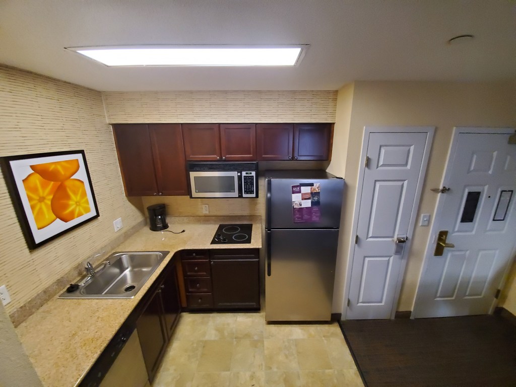 The Residence Inn offers 4 different types of Hotel suites. They have Studios (1 king, sofa bed), 1 bedroom (1 queen, sofa bed or 2 queens, sofa bed) and a 2 bedroom suite. Each suite has a full size fridge, microwave, sink and stove top.
