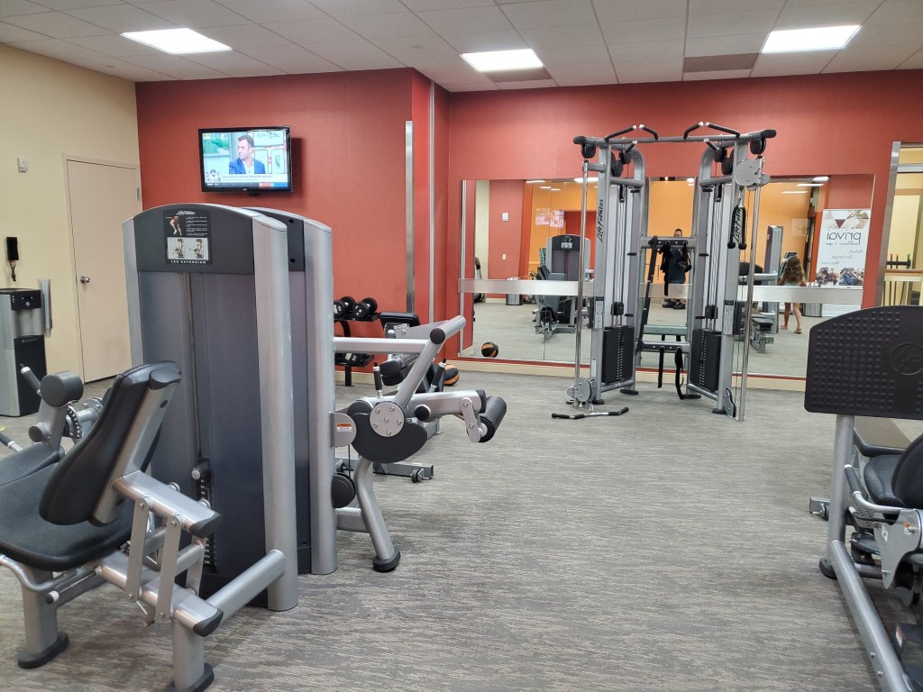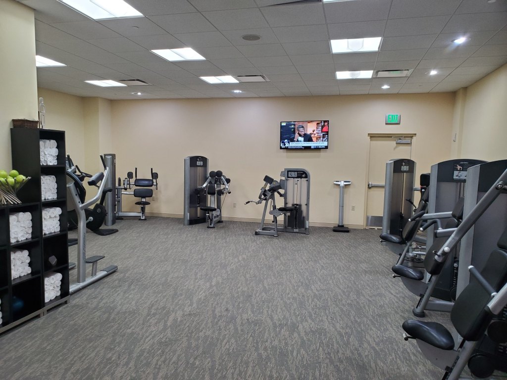 The finesse center is a nice size. You could easily have a dozen people working out in here and still have room for more. Towels are provided and there are a few TVs keeping you up to date on the latest news and sunny Florida afternoon thunderstorms.
