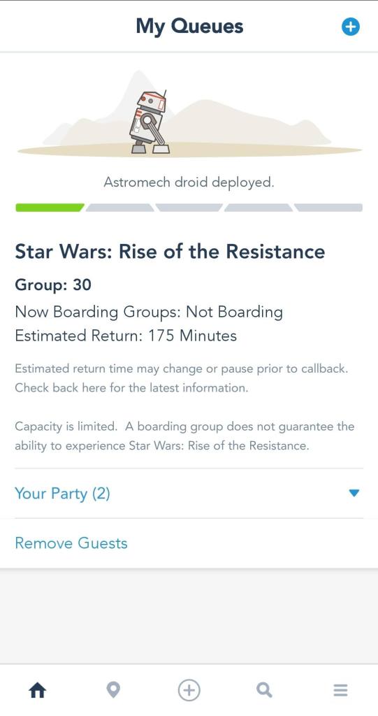 We sat down to enjoy a coffee and some water and to get out of the morning sun. As I was checking the app for my boarding time it showed no groups boarding. It might have been 10:30 at this point and Rise of the Resistance was already broken down. To make things worse Runaway Railroad was also down.