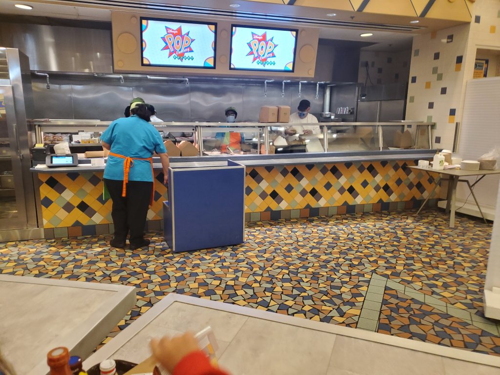 Now for the dining area. Boy, where do you start with that? Well, lets first say that I never thought the food court at POP was anything to write home about. Before the coronavirus Pandemic they never really offered anything that jumped out to me and screamed you got to try this. Unlike food that is offered right across the lake at Art of Animation.