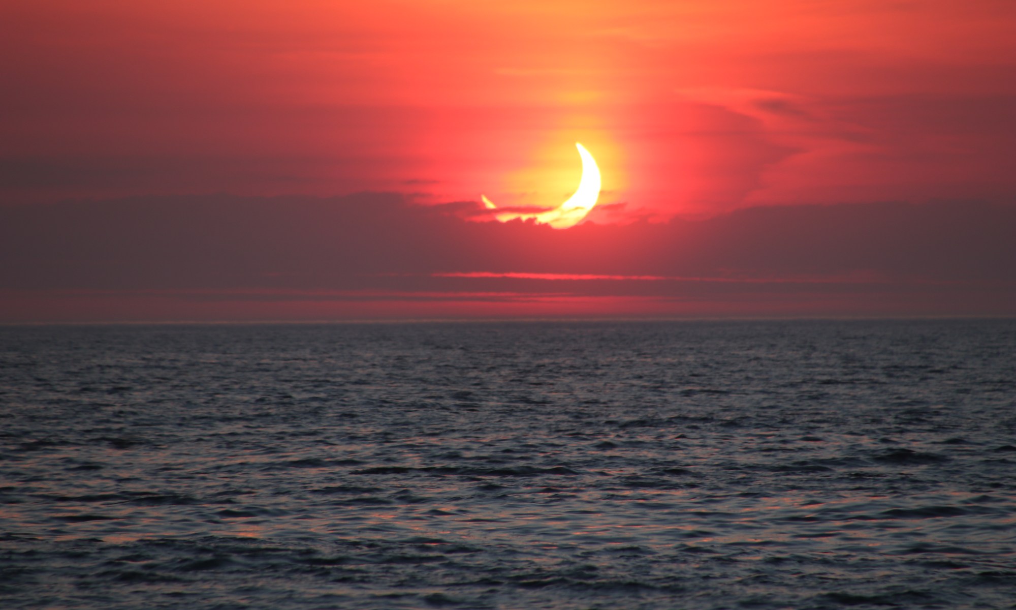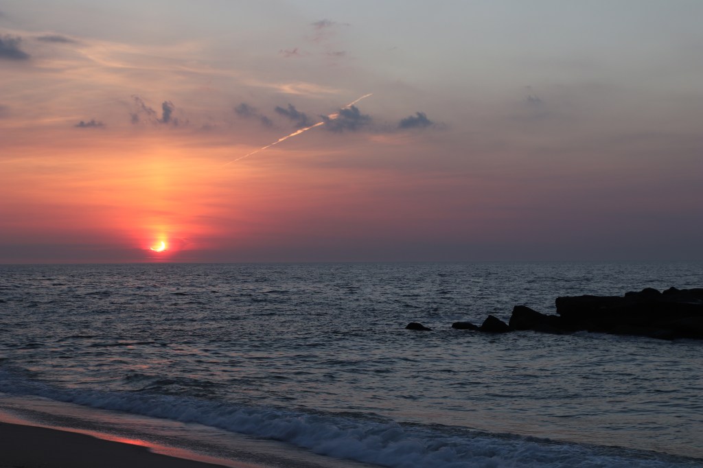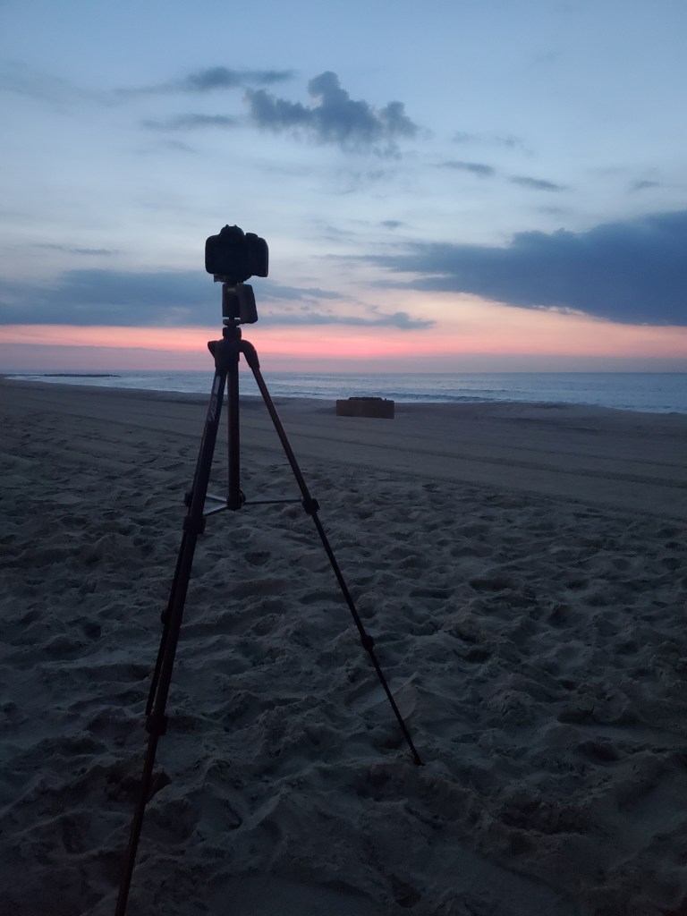 There was a nice cool breeze coming off the ocean and the soothing sound of the crashing waves. Looking out towards were the sun would be rising, I started seeing the sky turn from black to blue than a hint of red. Was I going to get a spectacular, colorful sunrise and be able to watch the moon take a bite out of the sun? It was too early to tell. It was only 4:45 and I had 45 minutes to go but my fingers were crossed.