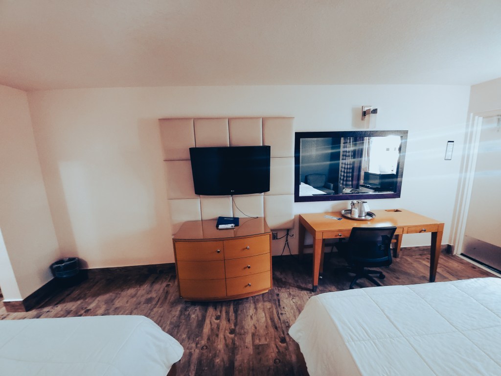 The rooms at Travelodge by Wyndham won’t blow you away most of the time. However, this room was a great size and had flooring and not carpet. It is nice to see most places getting ride of having carpet in the rooms.