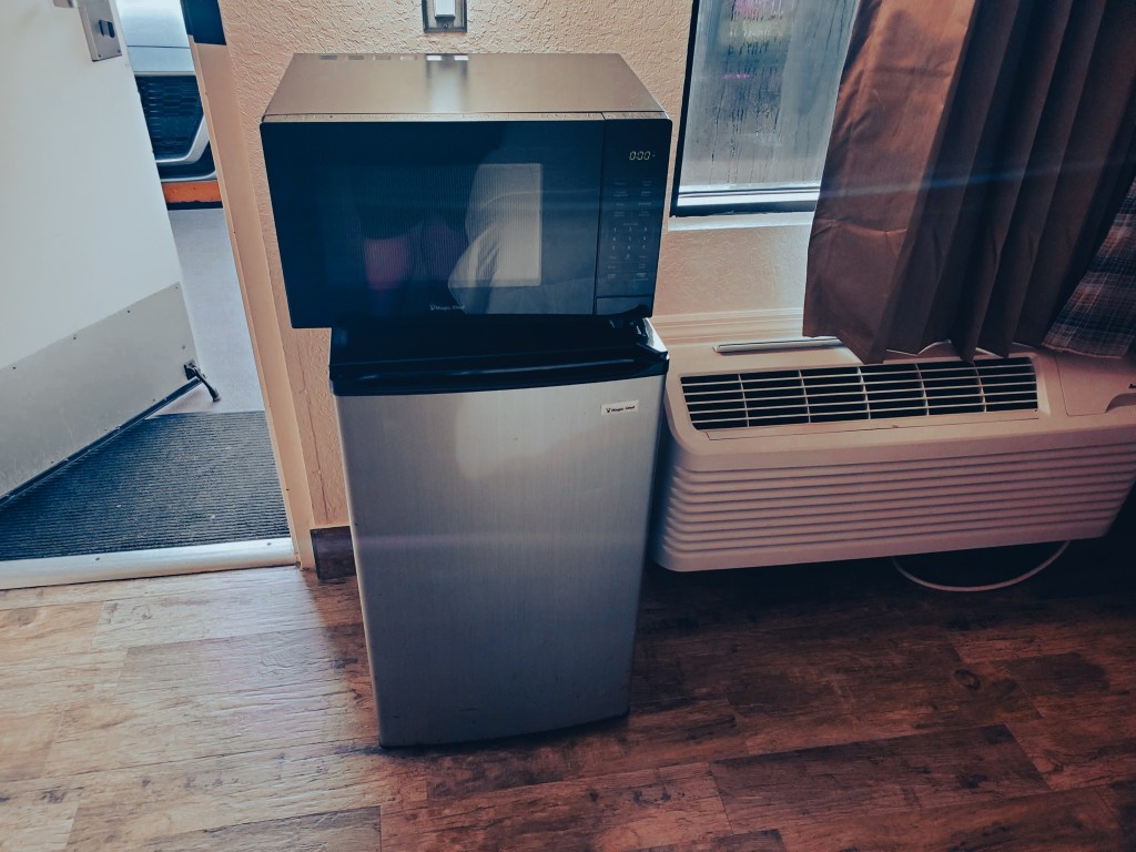 The room had everything you would need to be comfortable while you stay. It has a microwave, mini fridge, TV, and a couple outlets. I did found the fridge and microwave to be in an odd spot. However, I don’t think it really takes away from the room.