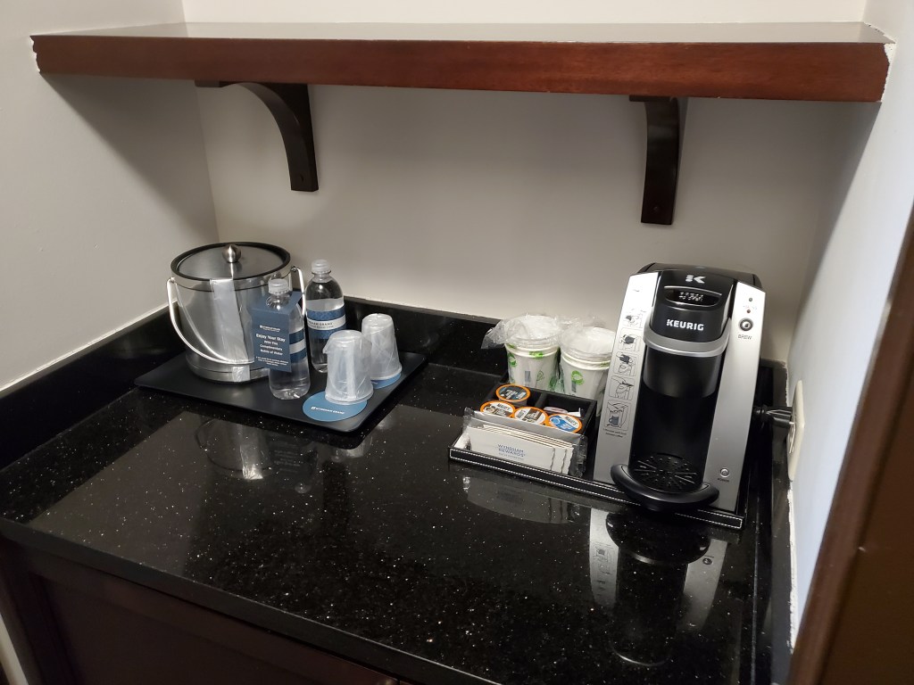 All of the rooms have a 55โ 4K flat screen TV, Keurig coffee maker, mini fridge, and a great little table. Like I said the king bed rooms also have a couch and coffee table. Plus the rooms also have a decent amount of outlets and some with USB ports so it is easy to plug in your phone.