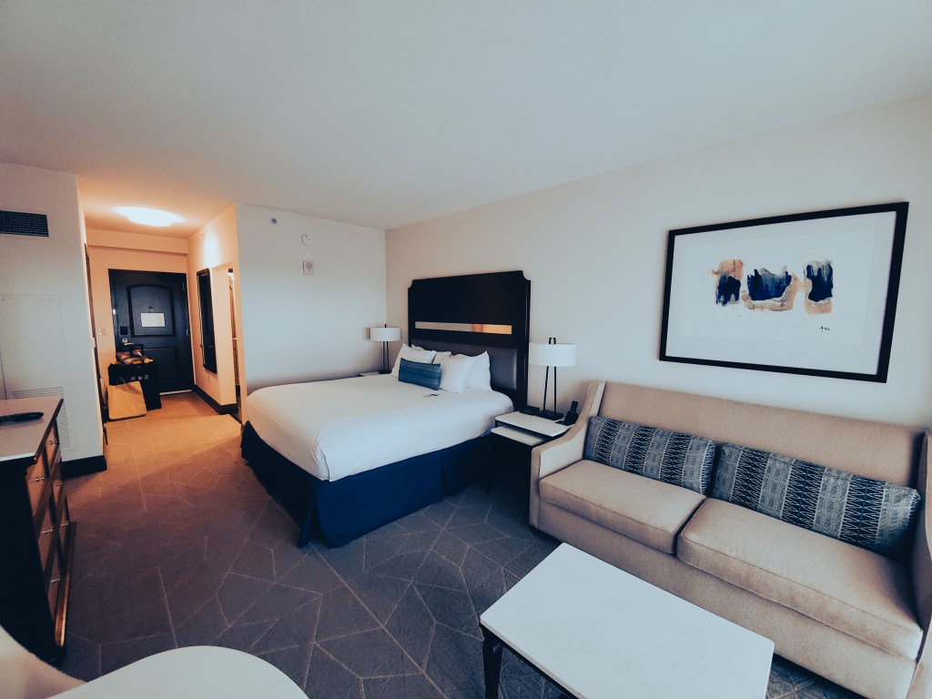 You have so much space in the rooms with the King size bed plus you have a couch and coffee table. This was the room that we had for two nights. Plus we had the balcony. The view wasn’t the greatest but it was nice to have. I sat out there for a good amount of time. You get a nice breeze out there too.