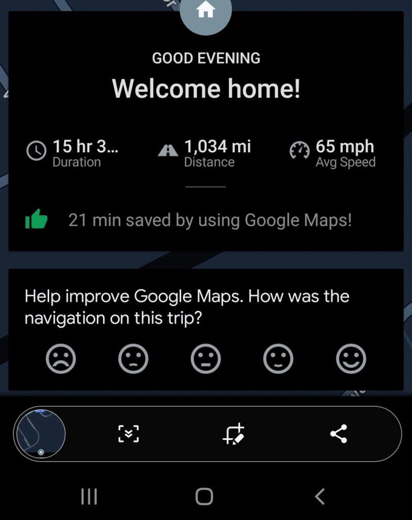 I made it home a little before 8:30 at night. It took 15 hours and 39 minutes in total to drive back. That includes stopping for gas and food. As you can see from the picture below we averaged 65 mph. I couldn’t have asked for a better trip home. I couldn’t have asked for a better trip overall. It was a long one but a great one.