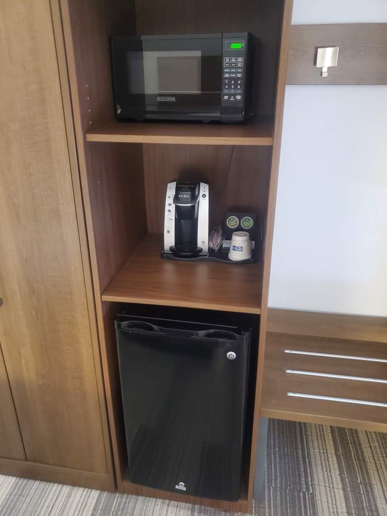 The room also comes with a mini fridge, microwave, and Keurig. I felt like I was able to put more in the mini fridge than I have at other places. The addition of a Keurig over the normal hotel coffee is a great thing. Hotel room coffee is horrible. Having a Keurig at least gives you a chance for a decent cup in the morning.
