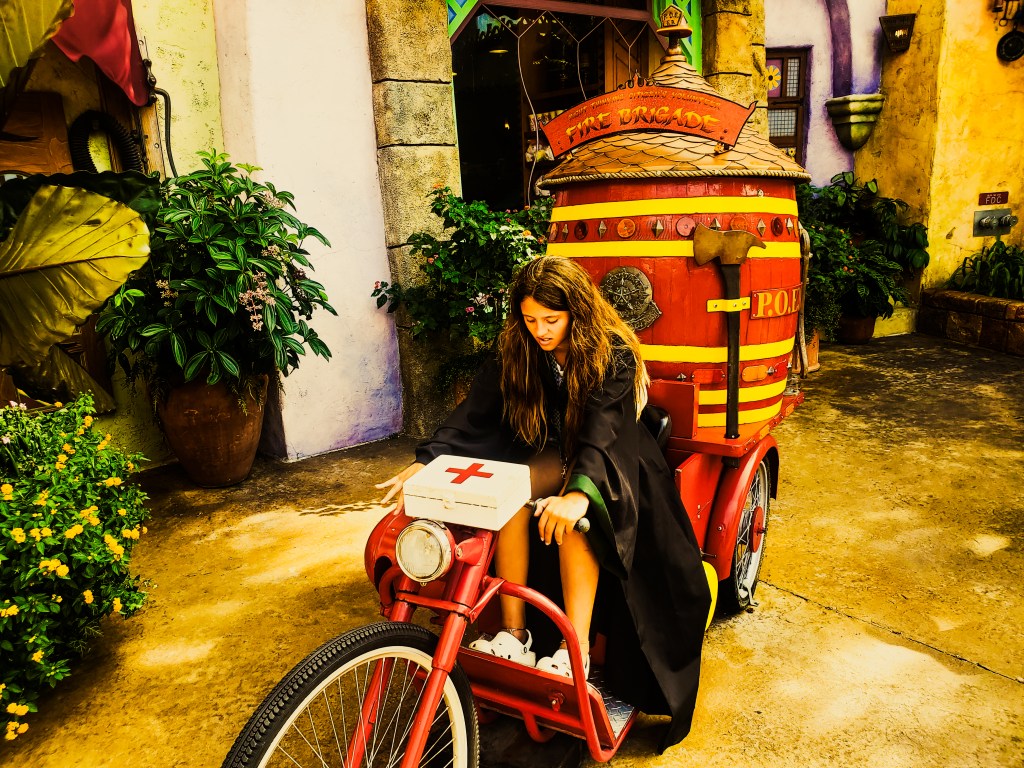 All I know is once I get my key I can pull into the parking garage and park the car till it was time to unload it. We parked the car and got out my daughter’s Harry Potter Robe so she could wear it to the park. I can say I will never understand how she can wear that robe in the Florida heat but she does and doesn’t complain at all.