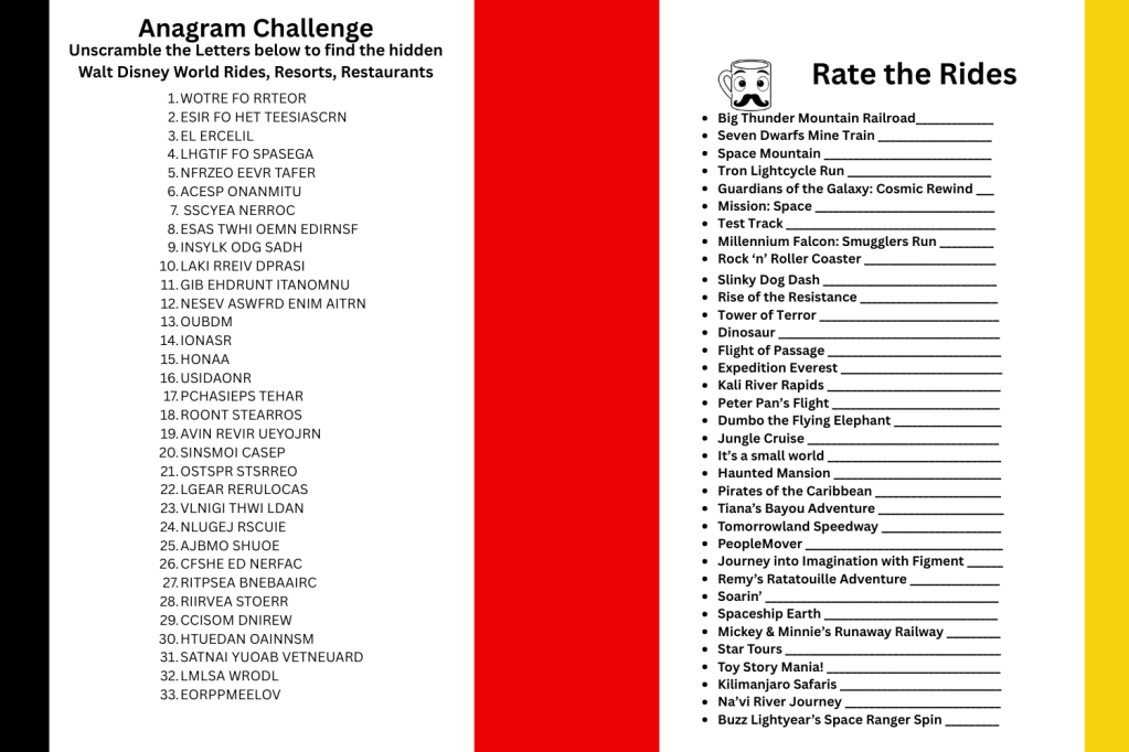 Think you know the parks like the back of your hand? Put your brainpower to the test with this bonus activity that scrambles up familiar names and attractions for you to decode!