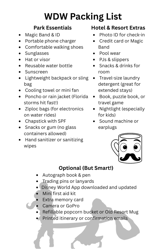 Don’t start your trip without it! This handy page helps you make sure you’ve packed the essentials — from comfy shoes to magic bands, reusable water bottles, and beyond.